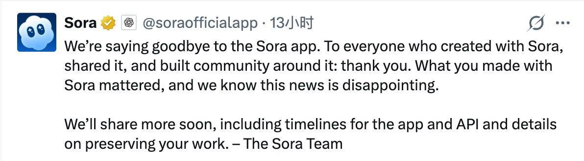 Sora团队在社交平台上正式发布了告别消息:“我们要和Sora应用说再见了。感谢所有与Sora一起创作、分享并围绕它建立社区的人……我们知道这个消息令人失望。我们很快会分享更多内容,包括应用和API的时间表,以及保存作品的细节。”